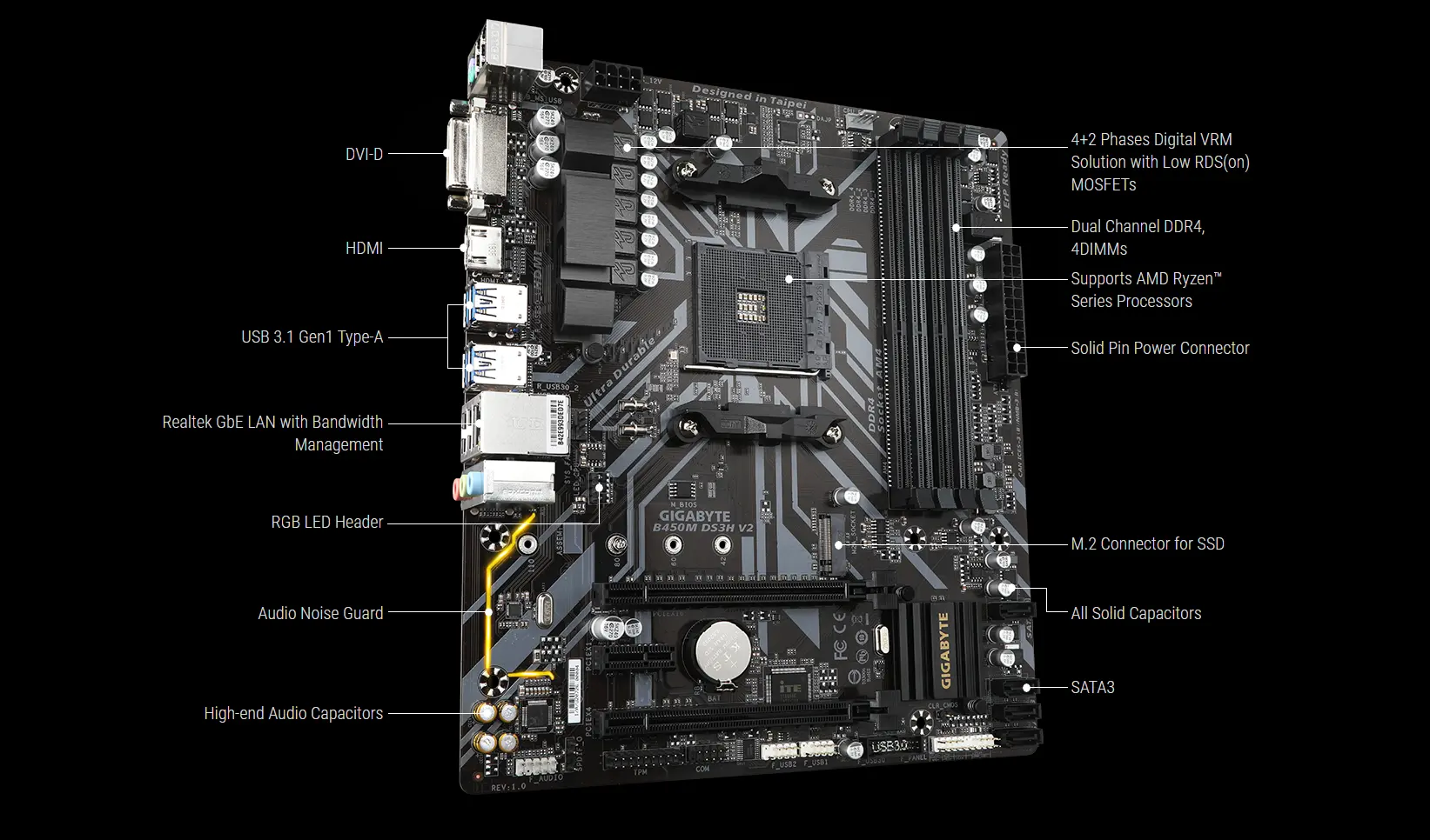 Mainboard Gigabyte B450M DS3H V2: Siêu bền với Giải pháp Digital VRM AMD B450, LAN Realtek GbE quản lý băng thông, Khe cắm PCIe Gen3 x4 M.2, Resistor chống lưu huỳnh, Đèn LED RGB, Hỗ trợ CEC 2019
