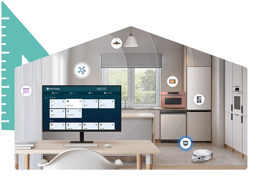 *Công nghệ, chức năng và tính năng khả dụng có thể khác nhau tùy theo quốc gia, nhà cung cấp dịch vụ, môi trường mạng hoặc sản phẩm và có thể thay đổi mà không cần thông báo. *Yêu cầu kết nối Wi-Fi, Bluetooth hoặc mạng không dây khác và các thiết bị đã đăng ký với ứng dụng SmartThings. *Cần có SmartThings Dongle riêng để kết nối với các thiết bị Zigbee và Thread. (Không hỗ trợ kết nối với thiết bị Z-Wave).